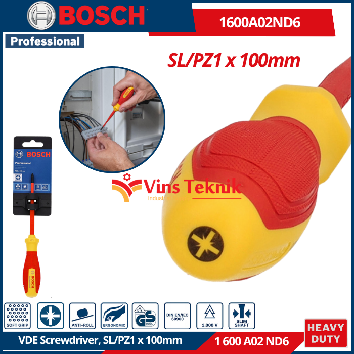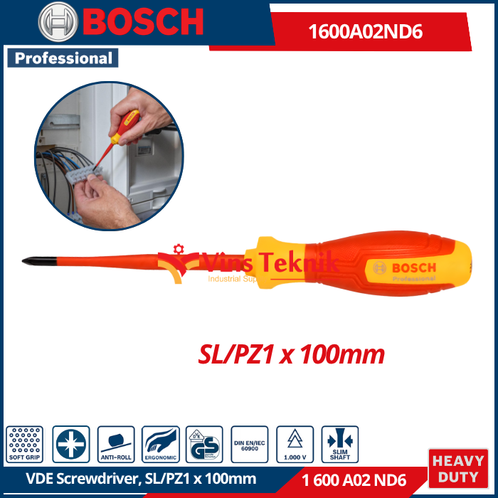 Bosch 1 600 A02 ND6 adalah Obeng VDE (SL/PZ) 1 x 100 mm Professional. Alat ini dirancang khusus untuk pekerjaan kelistrikan profesional, terutama untuk terminal blok, sakelar, dan kotak sekring yang sering menggunakan sekrup kombinasi.