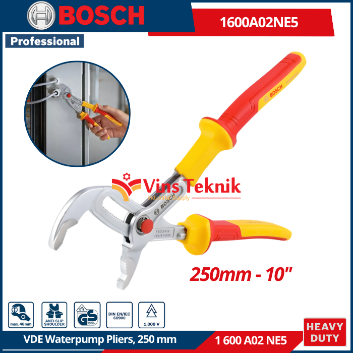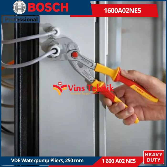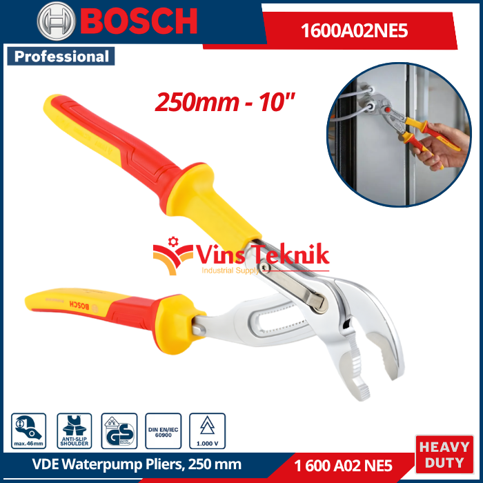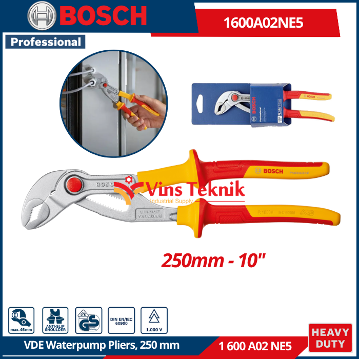 BOSCH 1 600 A02 NE5 adalah Tang Burung VDE (VDE Water Pump Pliers) 250 mm Professional. Alat ini dirancang untuk mencengkeram, memutar, atau menarik objek seperti pipa dan mur dengan keamanan tinggi bagi teknisi listrik.