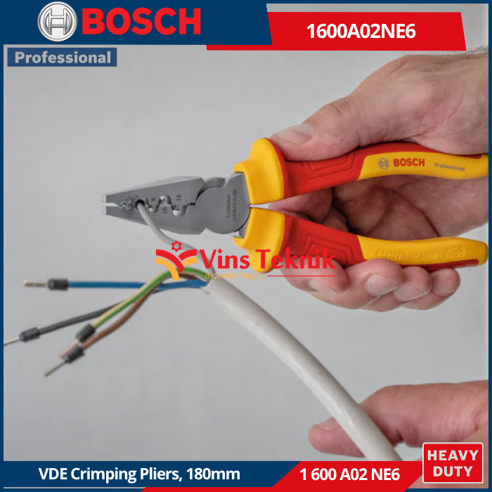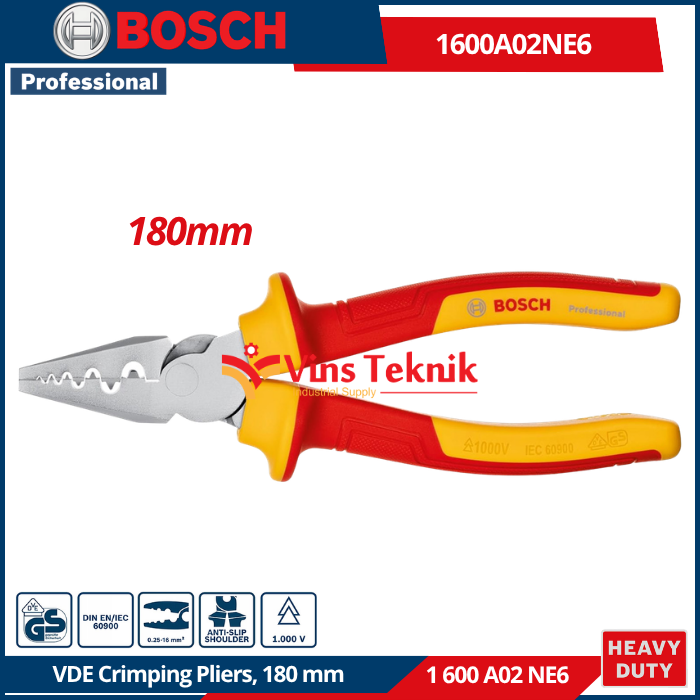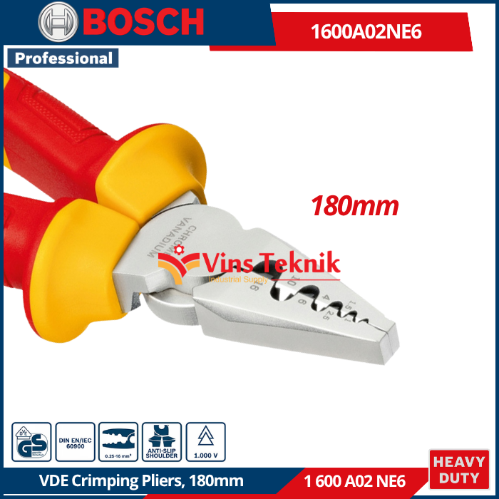 - Material Tangguh : Kepala tang terbuat dari baja Chrome Vanadium (CrV)... Read More Bosch 1 600 A02 NE6 adalah nomor seri untuk Tang Crimping VDE 180 mm Professional. Alat ini merupakan perkakas tangan profesional yang dirancang khusus untuk pekerjaan kelistrikan yang aman.