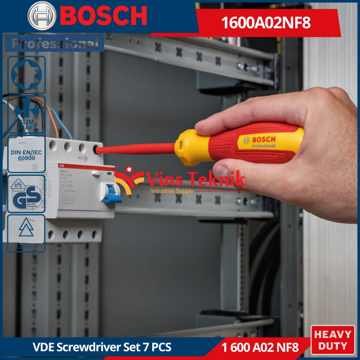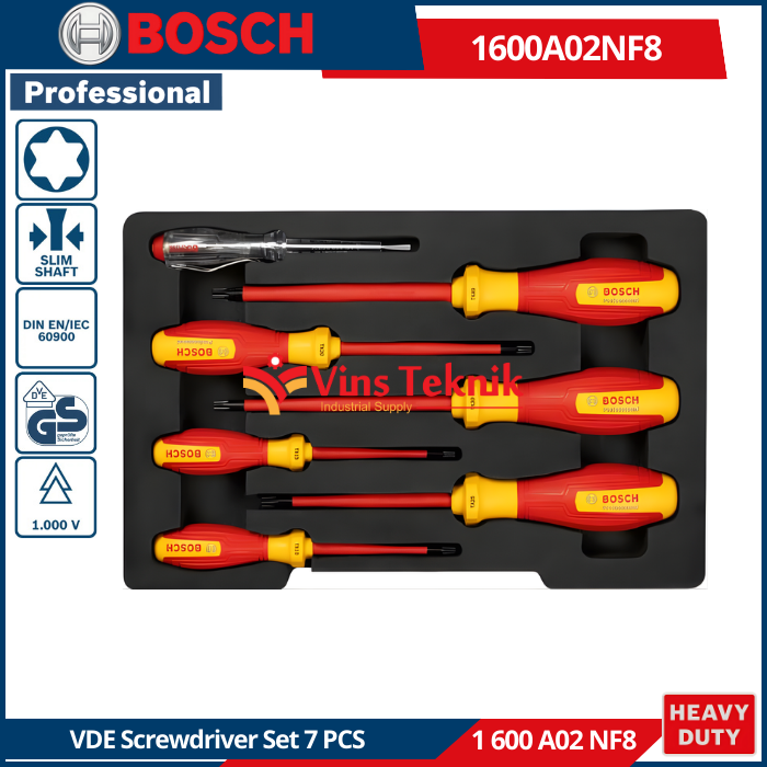 BOSCH 1 600 A02 NF8 adalah nomor komponen untuk Set Obeng Torx VDE Profesional 7 buah yang dirancang untuk pekerjaan listrik berinsulasi