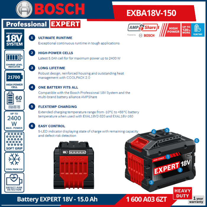 - Kompatibilitas: Kompatibel dengan seluruh sistem Bosch Professional 18V dan aliansi baterai multi-merek AMPShare.