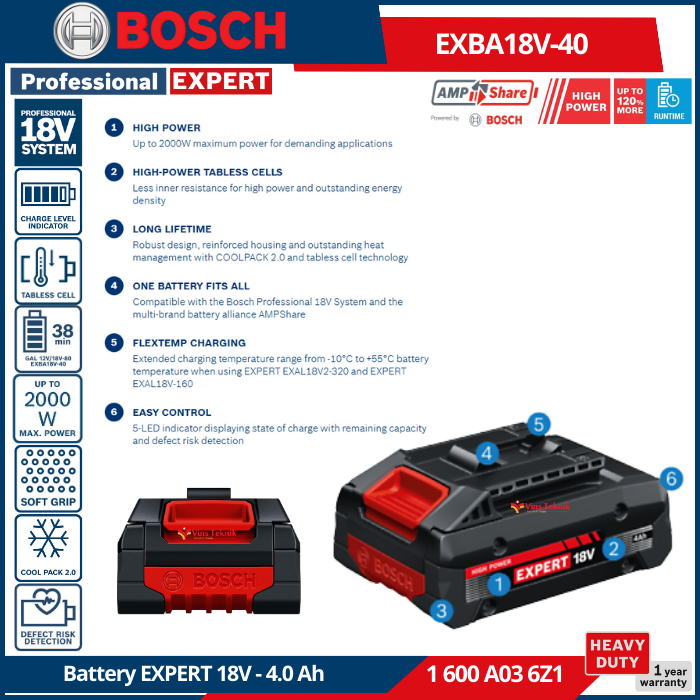 Bosch EXPERT EXBA18V-40 adalah unit baterai berdaya tinggi 18V dengan kapasitas 4.0 Ah yang dirancang untuk aplikasi berat, menawarkan daya maksimum hingga 2000 W dan waktu kerja yang luar biasa.