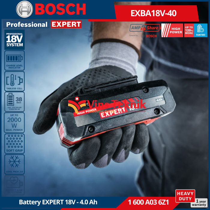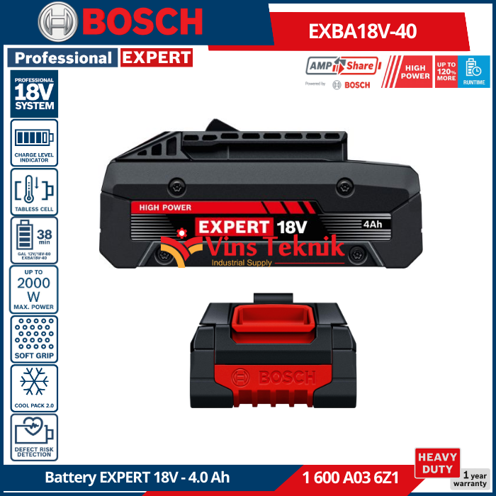- Masa Pakai Panjang : Desain yang kuat, rumah yang diperkuat,... Read More Bosch EXPERT EXBA18V-40 adalah unit baterai berdaya tinggi 18V dengan kapasitas 4.0 Ah yang dirancang untuk aplikasi berat, menawarkan daya maksimum hingga 2000 W dan waktu kerja yang luar biasa.