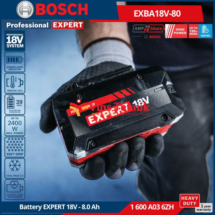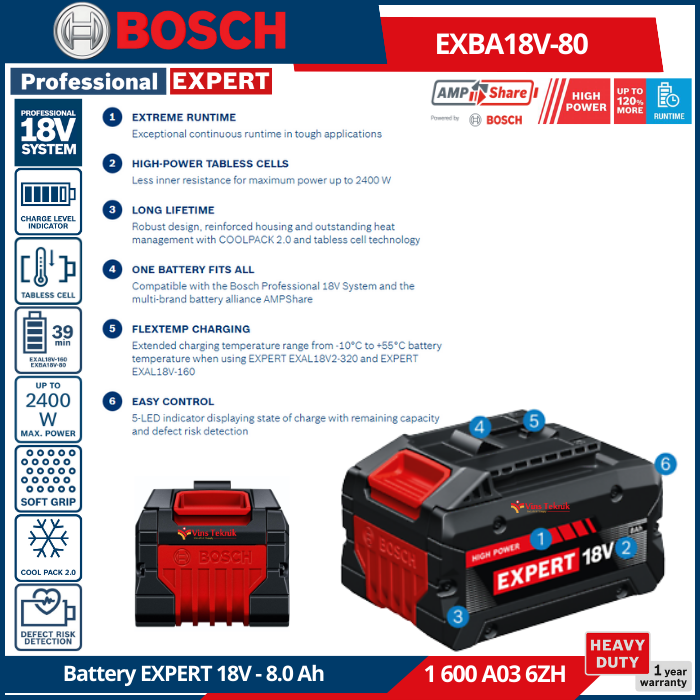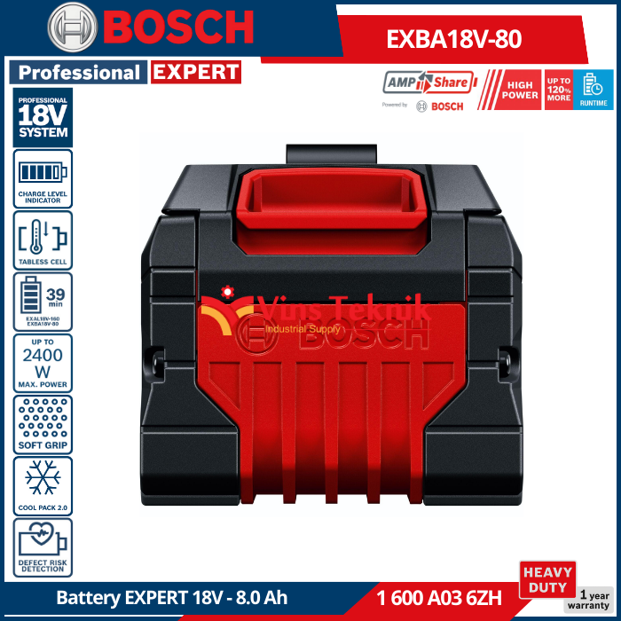 - Manajemen Panas yang Unggul:... Read More Bosch EXPERT EXBA18V-80 adalah unit baterai berdaya tinggi 18V dengan kapasitas 8 Ah yang dirancang untuk aplikasi berat, menawarkan daya maksimum hingga 2400 W dan waktu kerja yang luar biasa.