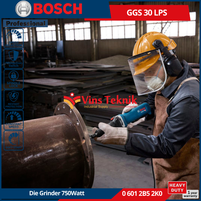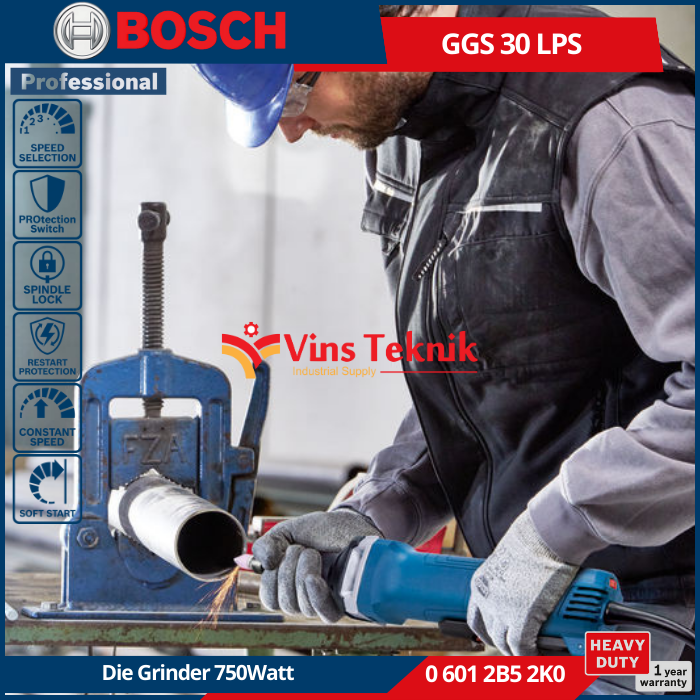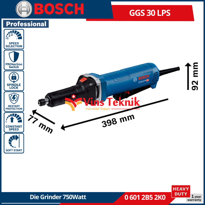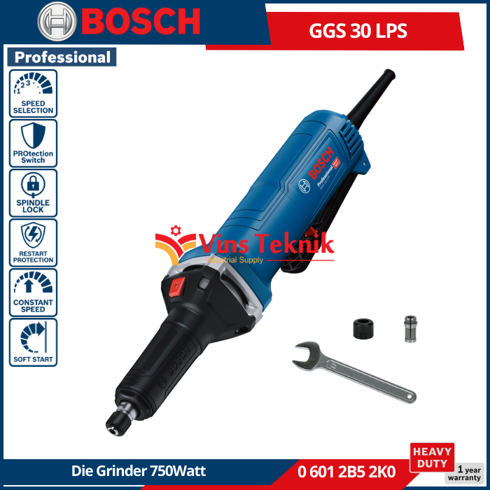 Bosch GGS 30 LPS Professional adalah gerinda lurus (die grinder) berperforma tinggi 750 Watt yang dirancang untuk menggerinda dan memoles logam, dengan fitur keselamatan canggih seperti kontrol KickBack dan sakelar proteksi
