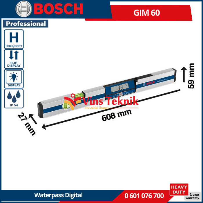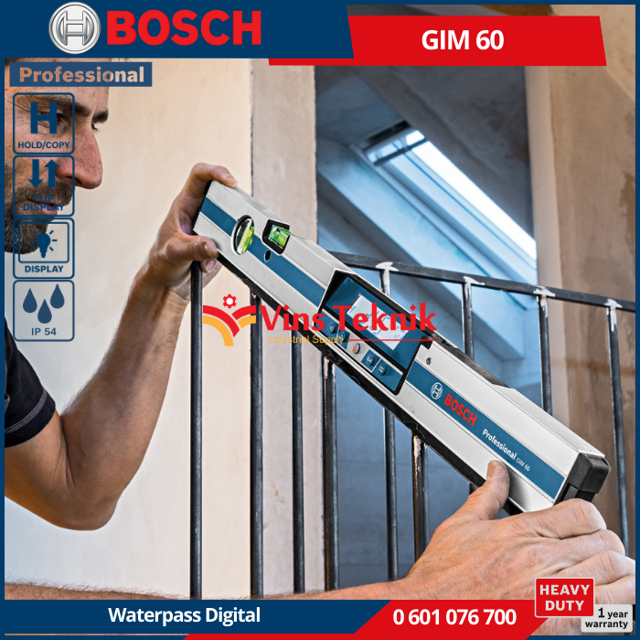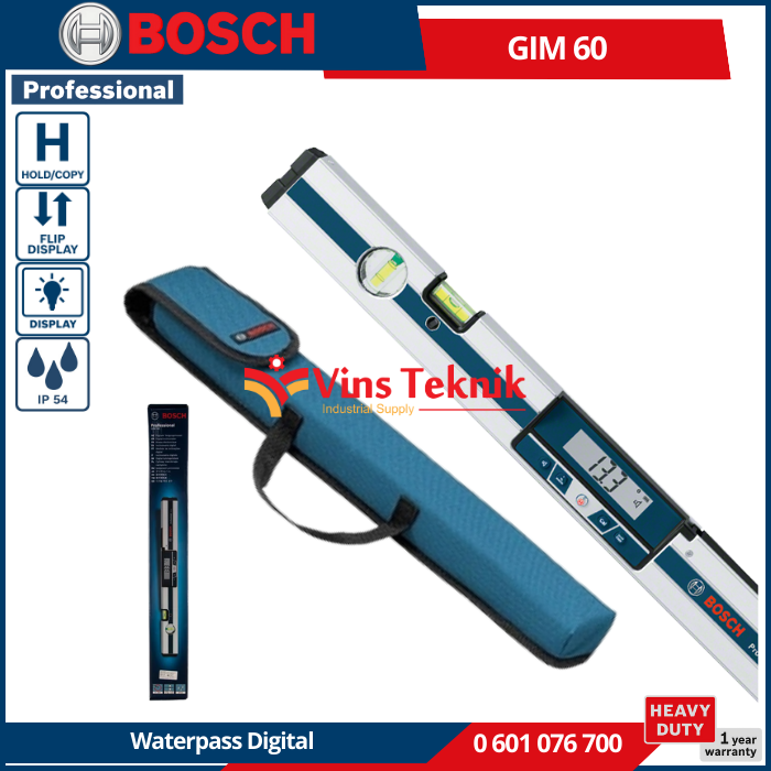 BOSCH GIM 60 adalah inklinometer digital profesional yang berfungsi sebagai pengukur kemiringan dan waterpass digital dengan panjang 60 cm. Alat ini dirancang untuk pengukuran kemiringan yang tepat dalam berbagai satuan.
