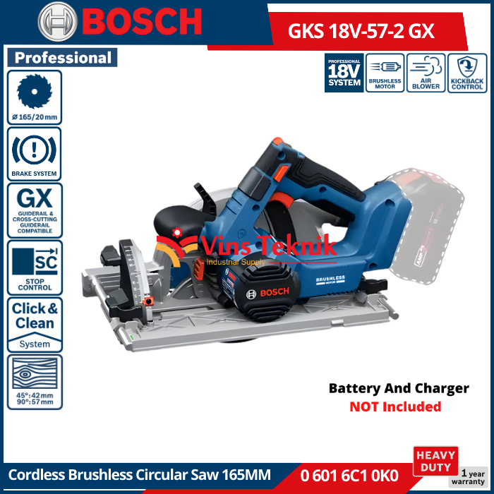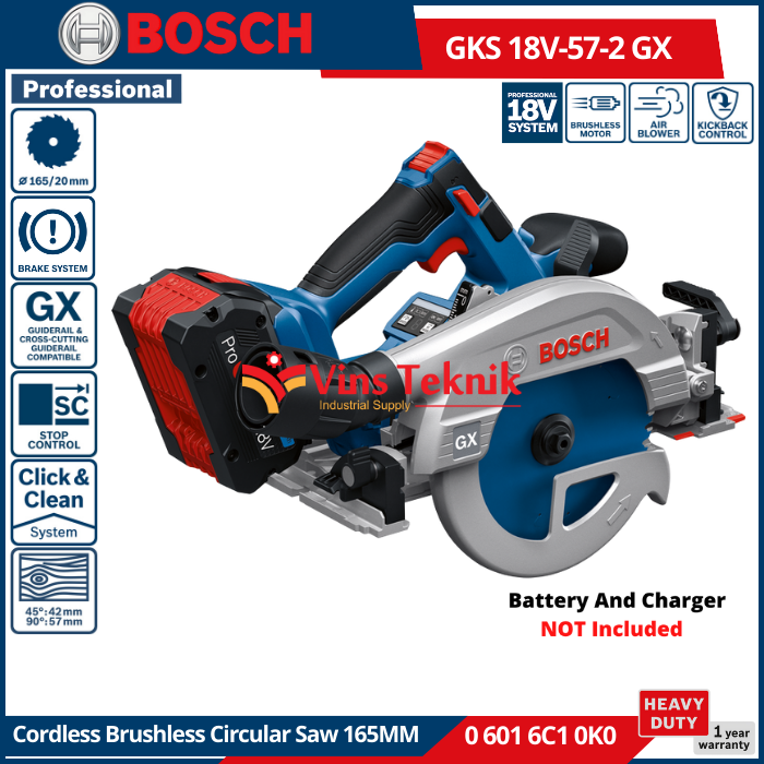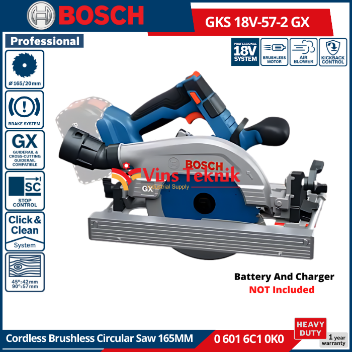 Bosch GKS 18V-57-2 GX Professional adalah gergaji sirkular nirkabel yang kuat dan presisi, dirancang untuk pekerjaan kayu profesional dengan fitur motor tanpa sikat (brushless) dan kompatibilitas rel pemandu