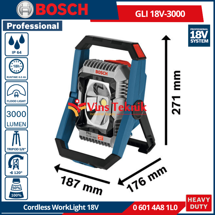 BOSCH GLI 18V-3000 Lampu Kerja Baterai 3000 Lumen Cordless Jobsite Light WorkLight 18V GLI18V-3000