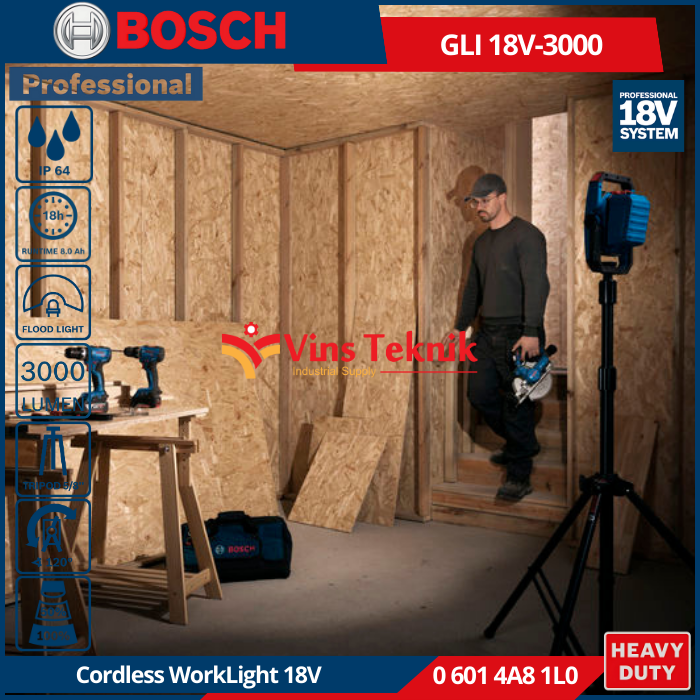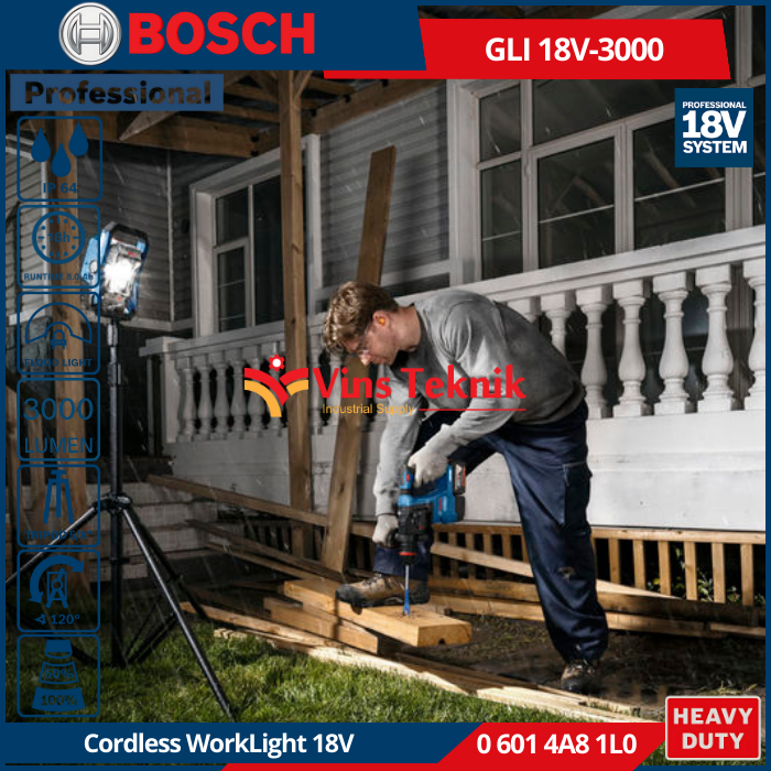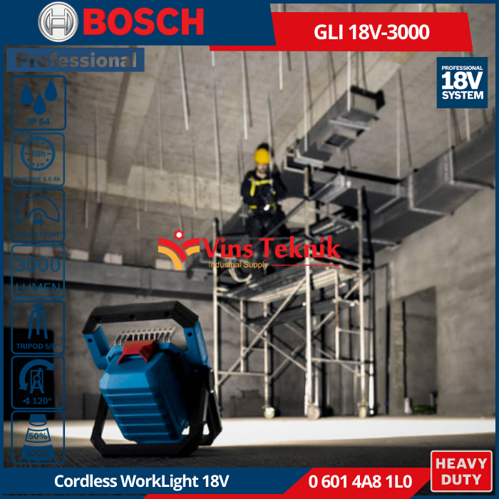 Bosch GLI 18V-3000 Professional adalah lampu kerja nirkabel yang menawarkan performa superior dengan kecerahan 3000 lumen dan dirancang untuk penggunaan di lokasi kerja yang menuntut