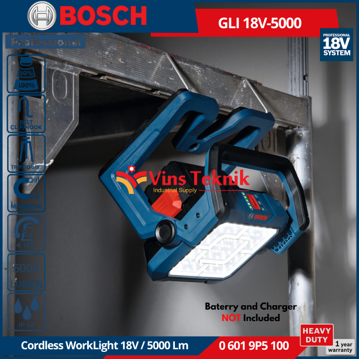 - Kompatibilitas : Lampu ini merupakan bagian dari Professional 18V System Bosch dan kompatibel dengan semua baterai Bosch Professional 18V (dijual terpisah)