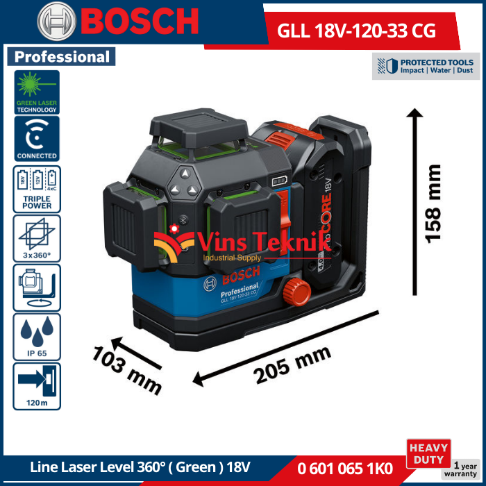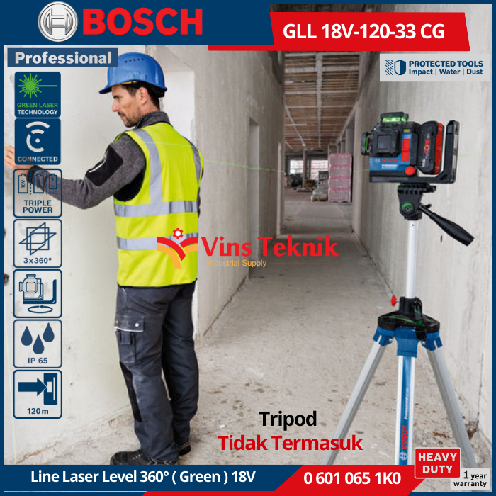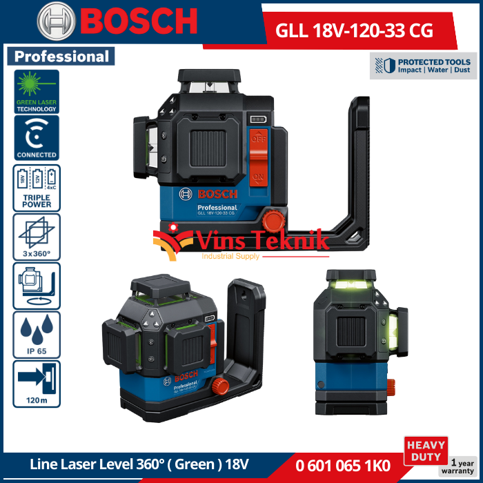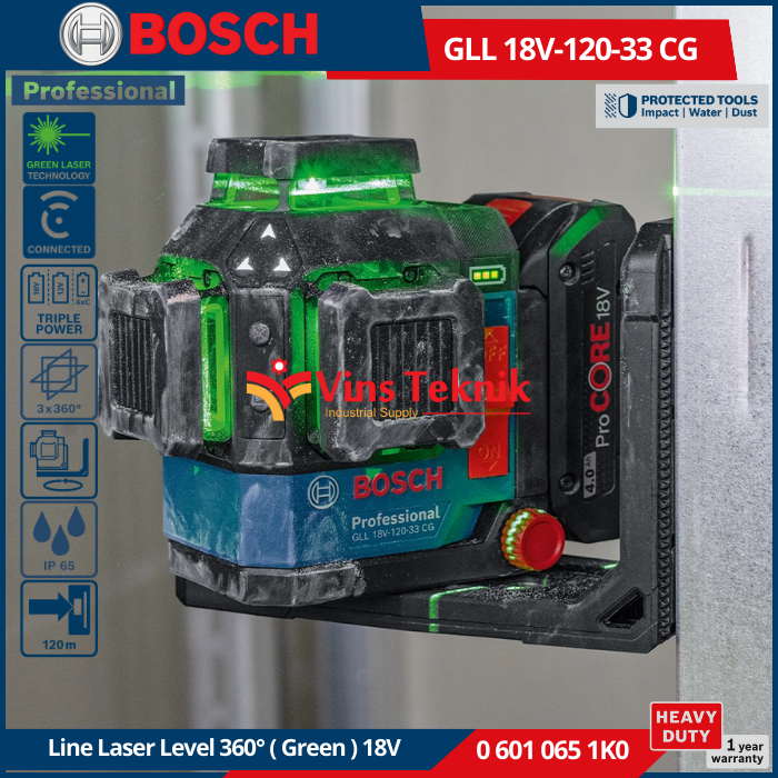 Bosch GLL 18V-120-33 CG Professional adalah laser garis tangguh yang dirancang untuk presisi tinggi dalam kondisi kerja yang sulit, menampilkan tiga garis laser hijau 360° yang cerah dan visibilitas yang ditingkatkan