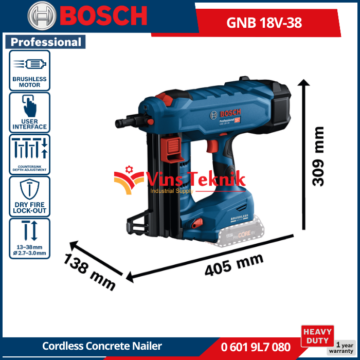 BOSCH GNB 18V-38 Professional Cordless Concrete Nailer adalah paku tembak beton nirkabel berperforma tinggi yang dirancang untuk pengencangan langsung trek baja pada material kokoh seperti beton dan baja. Alat ini menggunakan teknologi BITURBO Brushless untuk efisiensi dan daya tahan.