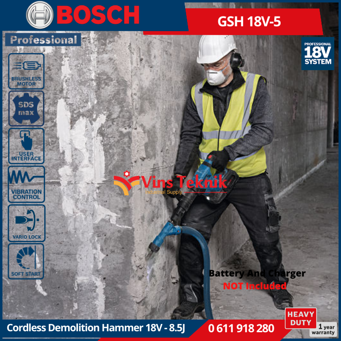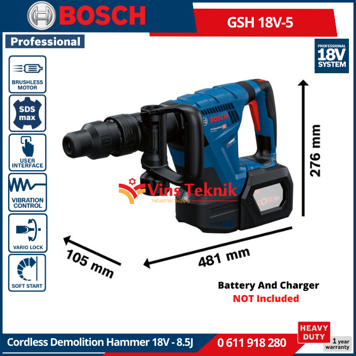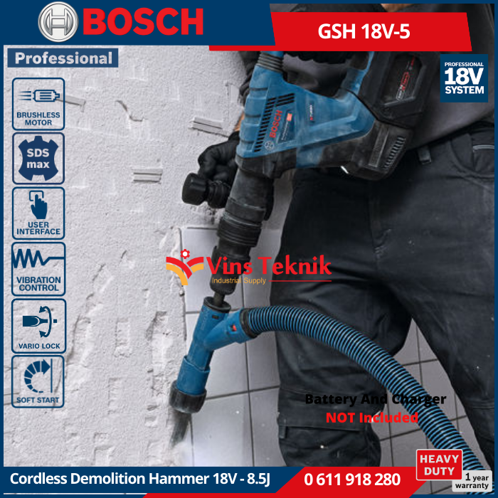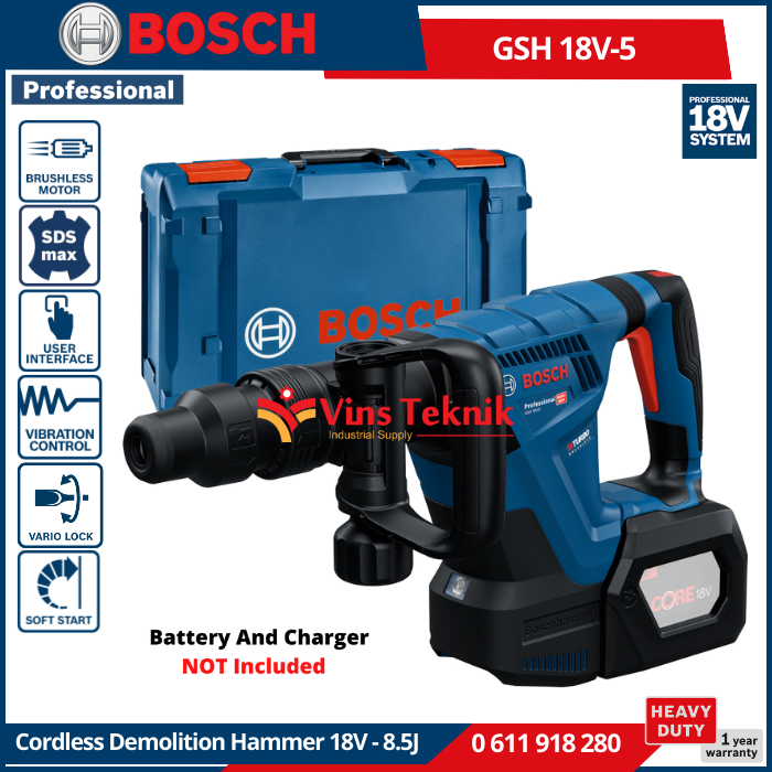 Bosch GSH 18V-5 Professional adalah palu penghancur (demolition hammer) nirkabel SDS-Max 18V yang dirancang untuk pekerjaan memahat dan pembongkaran yang berat, menawarkan kinerja setara alat berkabel berkat teknologi motor tanpa sikat (brushless) BITURBO
