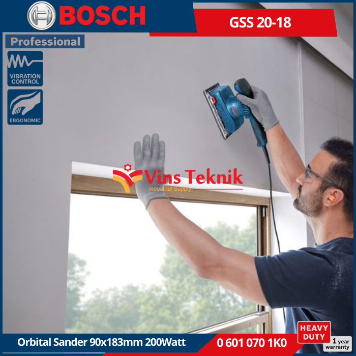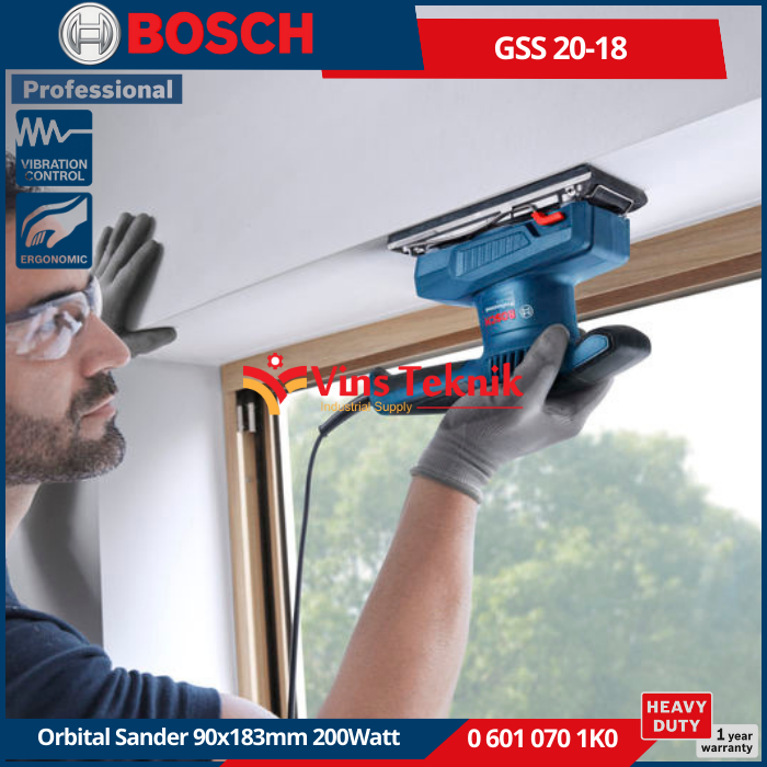 Bosch GSS 20-18 Professional adalah mesin amplas orbital (orbital sander) bertenaga listrik yang dirancang untuk pekerjaan finishing kayu dan perbaikan kendaraan dengan kenyamanan dan efisiensi. Alat ini dikenal karena tingkat getarannya yang rendah dan pengoperasian yang senyap di kelasnya.