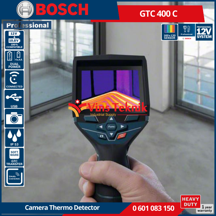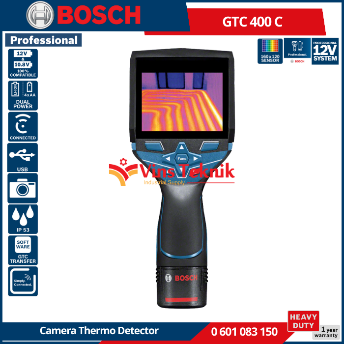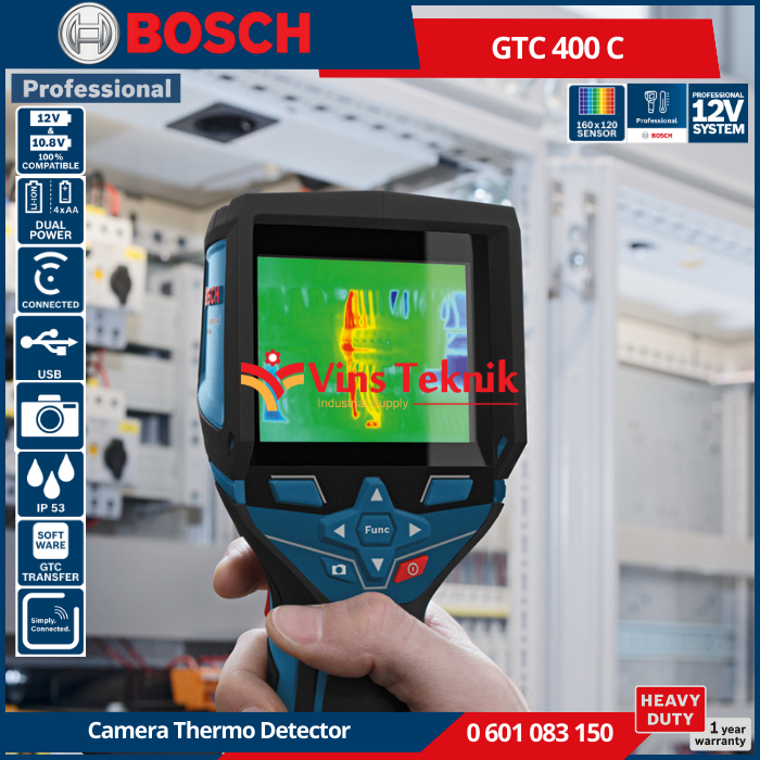 - Sistem Daya Ganda (Dual Power Source): Alat ini fleksibel karena dapat dioperasikan menggunakan baterai Li-Ion 12... Read More Bosch GTC 400 C Professional adalah kamera termal yang dirancang untuk mengukur dan memvisualisasikan perbedaan suhu secara cepat, ideal untuk aplikasi profesional seperti inspeksi insulasi, sistem pemanas, dan panel listrik.