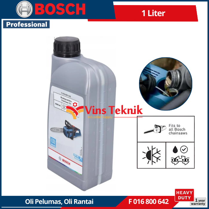 - Bahan Dasar :... Read More Bosch F016800642 adalah produk Oli Rantai (Chain Oil) khusus untuk gergaji mesin (chainsaw) produksi Bosch Professional yang bersifat biodegradable (ramah lingkungan). Oli ini dirancang untuk memberikan pelumasan optimal pada bilah dan rantai gergaji guna mengurangi gesekan dan keausan.