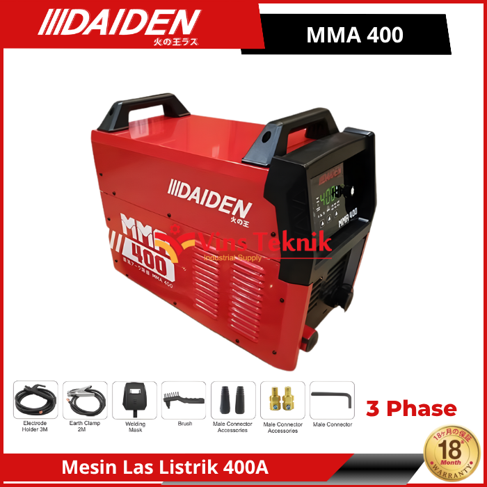 Mesin las DAIDEN MMA 400 adalah jenis mesin las listrik 400 Amp 3 phase yang cukup banyak digunakan oleh para welder. Mesin las listrik jenis ini dilengkapi dengan teknologi inverter yang konsepnya adalah mengambil ampere listrik kecil tetapi mengeluarkan listrik besar dan ketahanan mesinnya pun lebih bagus.