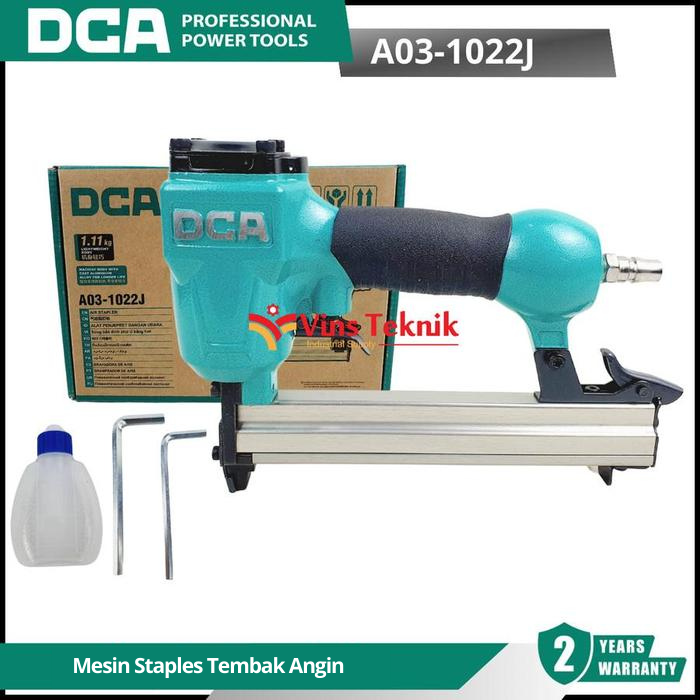 DCA A03-1022J adalah mesin paku tembak angin (air stapler) yang menggunakan tenaga tekanan udara dari kompresor untuk menembakkan paku/staples U berukuran maksimum 0.6x10x22 mm