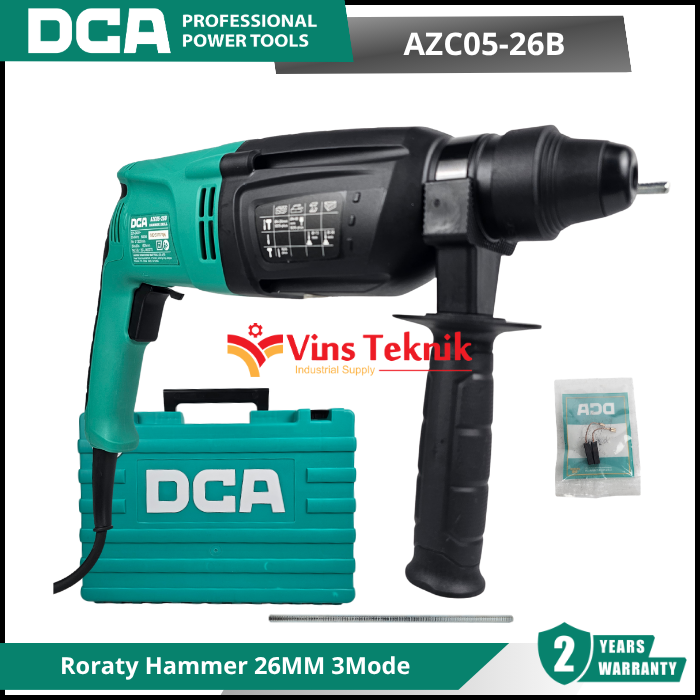 Ergonomis : Dilengkapi dengan auxiliary handle (gagang... Read More DCA AZC05-26B adalah mesin bor rotary hammer 3 fungsi yang dirancang untuk pekerjaan pengeboran beton, pembobokan ringan, dan pengeboran kayu atau besi. Model ini populer karena keseimbangan antara daya tahan dan harga yang terjangkau untuk kelas profesional maupun DIY