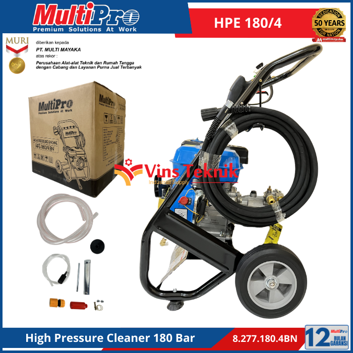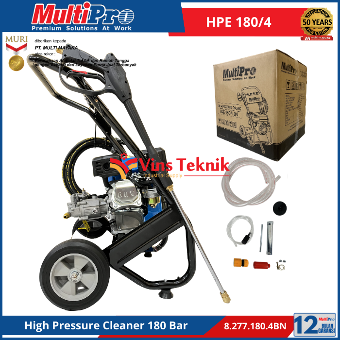 MULTIPRO HPE 180/4 adalah mesin cuci bertekanan tinggi (high pressure cleaner) bertenaga bensin yang dirancang untuk tugas pembersihan berat, seperti mencuci mobil, truk, teras, dan peralatan pertanian.