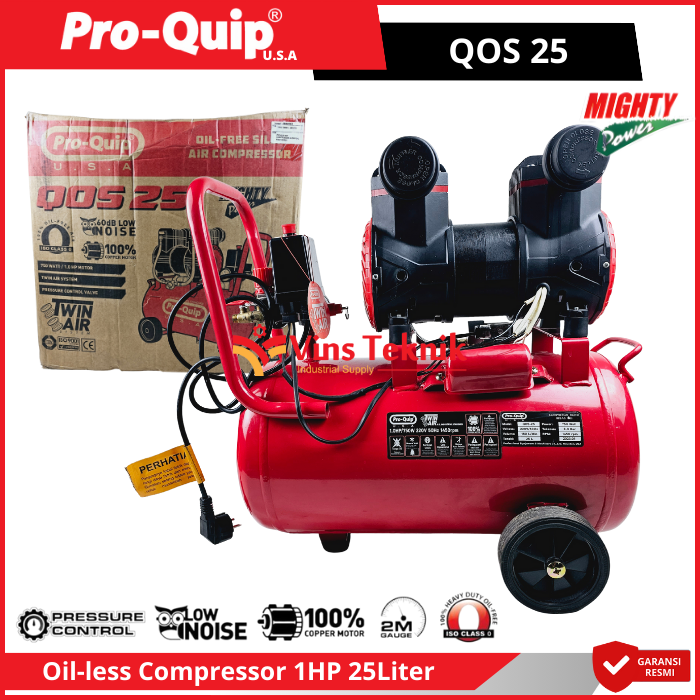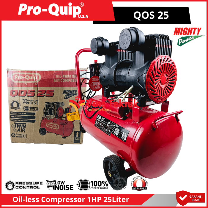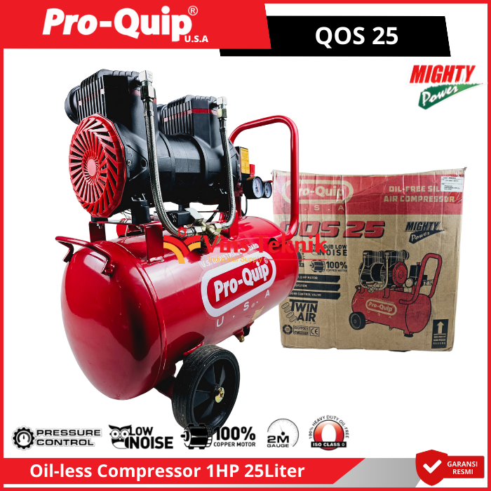 PROQUIP QOS 25 adalah sebuah kompresor udara tanpa oli (oilless/silent) berkapasitas 25 liter dengan motor 1 HP atau 750 Watt.