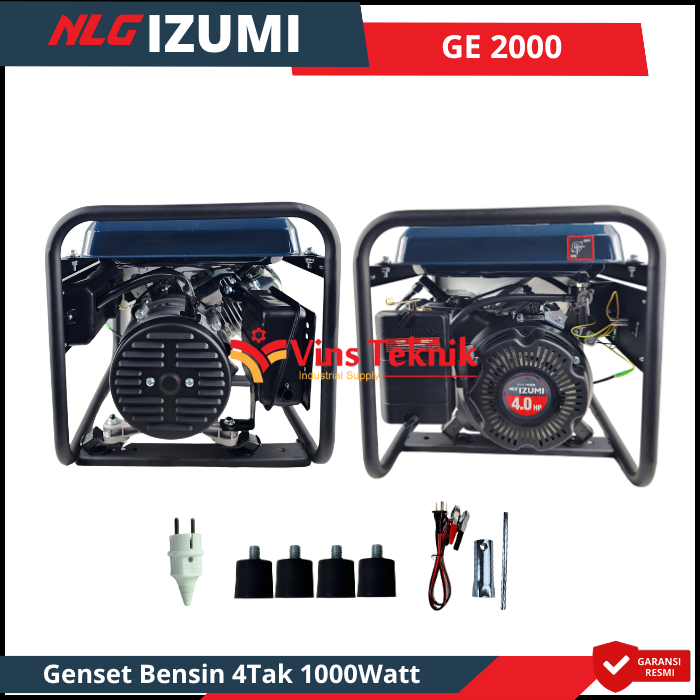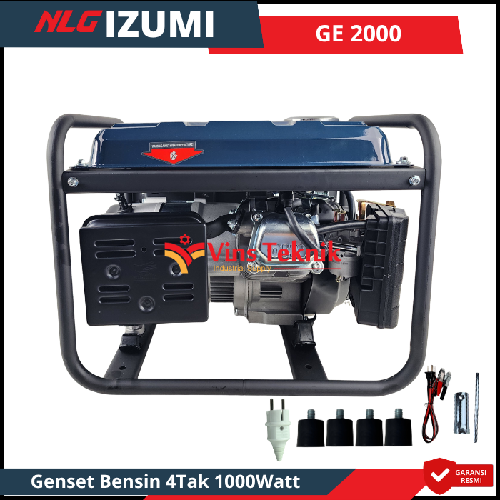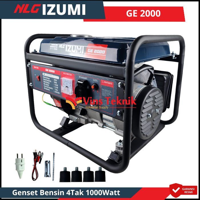- Sistem Starter: Dilengkapi dengan sistem tarik atau recoil... Read More Genset IZUMI GE 2000 (sering disebut juga NLG IZUMI GE 2000) adalah generator bensin 4-tak portabel yang dirancang untuk kebutuhan rumah tangga atau kantor skala kecil. Meskipun namanya mengandung angka "2000", kapasitas daya output riilnya adalah 1000 Watt.