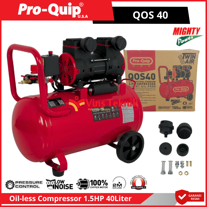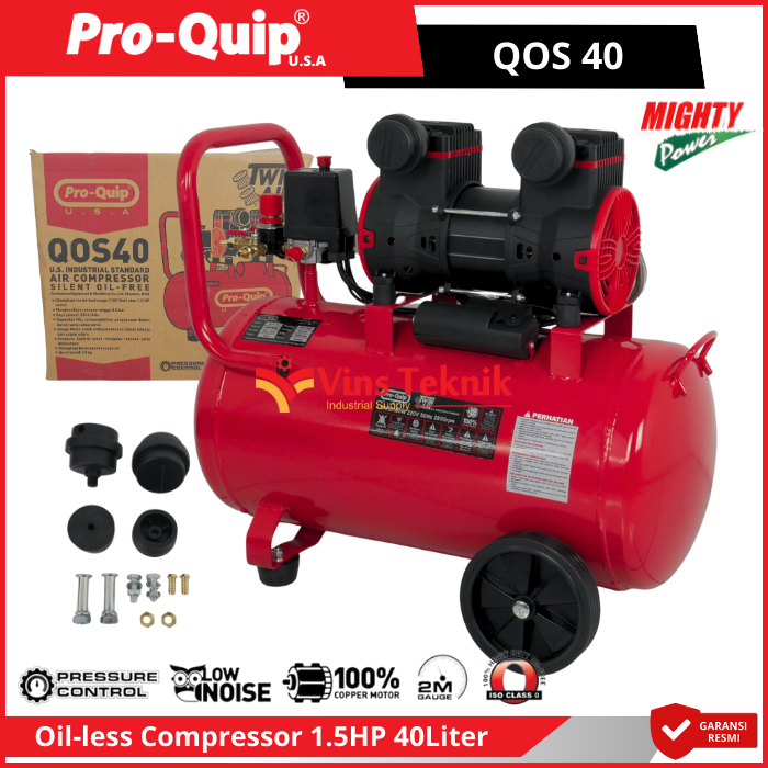 PROQUIP QOS 40 adalah sebuah kompresor udara tanpa oli (oilless/silent) berkapasitas 40 liter dengan motor 1.5 HP atau 1100 Watt.