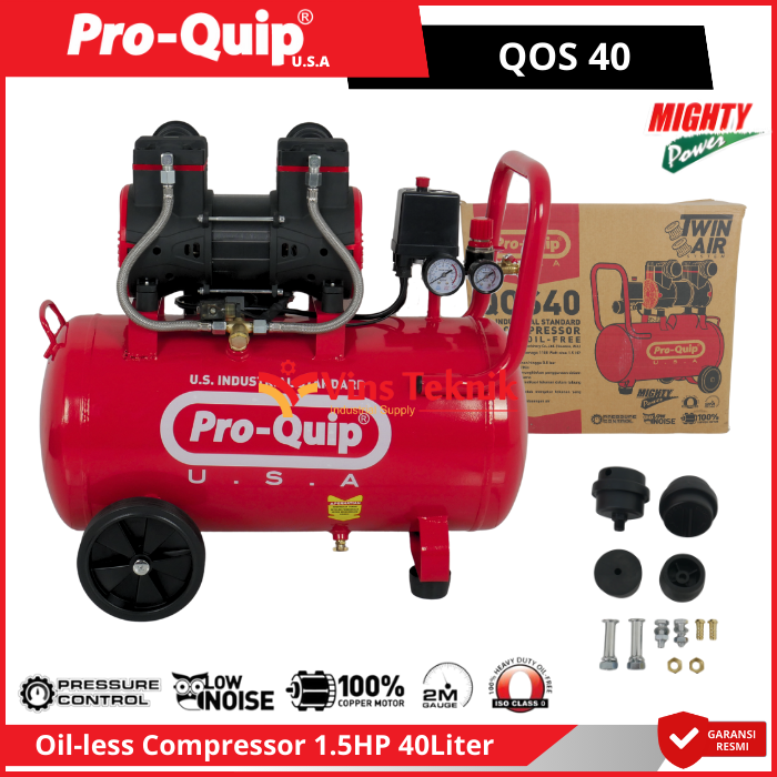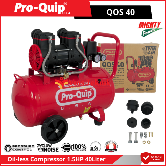 - Konstruksi Berkualitas : keunggulan tangki yang... Read More PROQUIP QOS 40 adalah sebuah kompresor udara tanpa oli (oilless/silent) berkapasitas 40 liter dengan motor 1.5 HP atau 1100 Watt.
