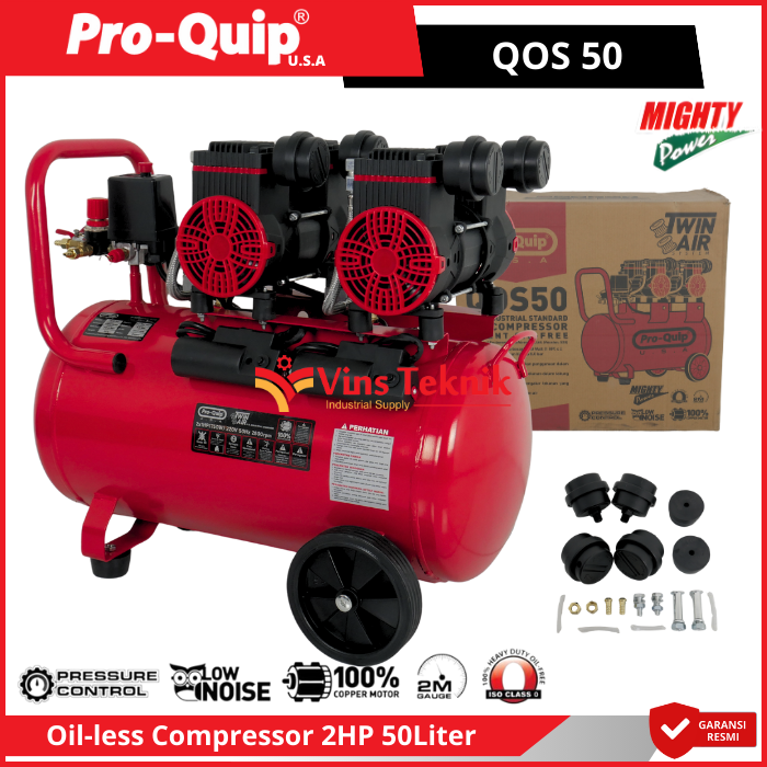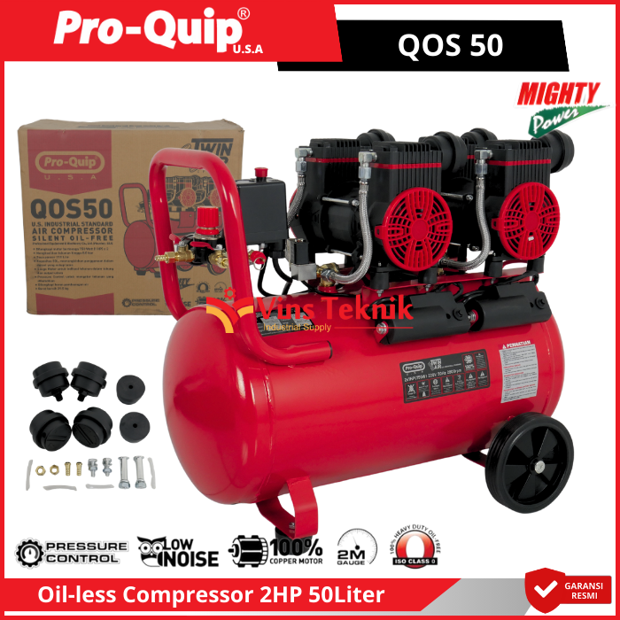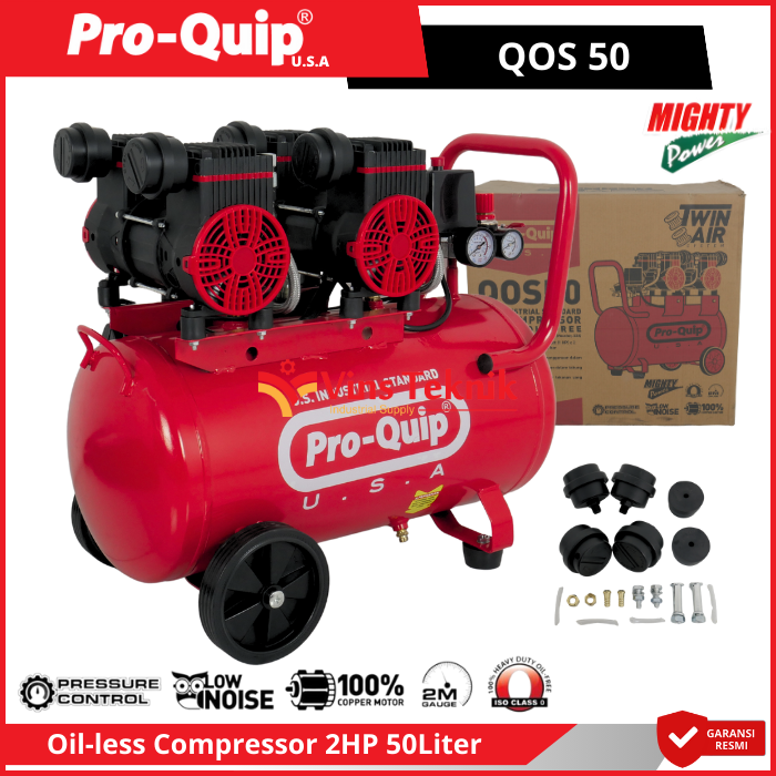 PROQUIP QOS 50 adalah sebuah kompresor udara tanpa oli (oilless/silent) berkapasitas 50 liter dengan motor 2 HP atau 1500 Watt.