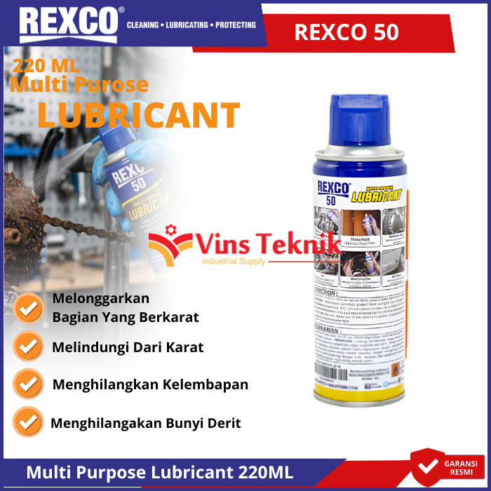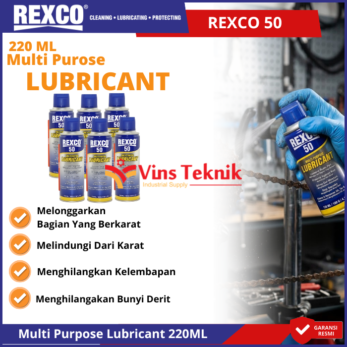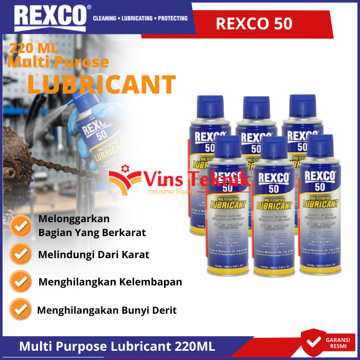 REXCO 50 Multi Purpose Lubricant 220ml adalah cairan multifungsi yang dirancang untuk melumasi, membersihkan, dan melindungi berbagai peralatan logam