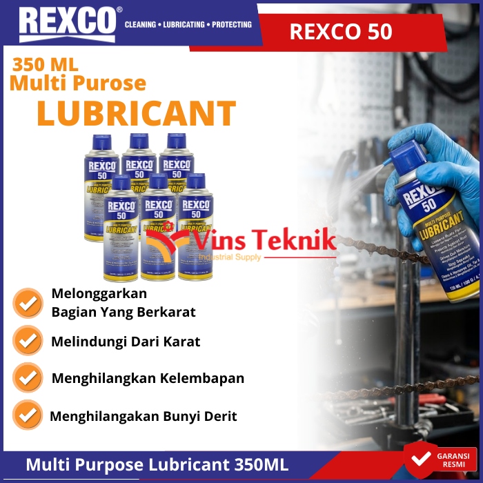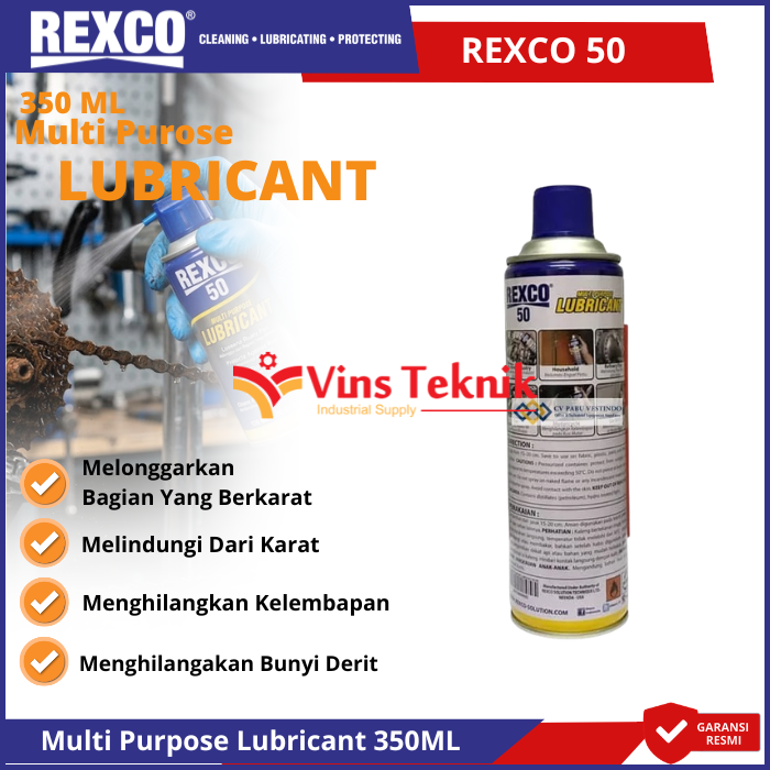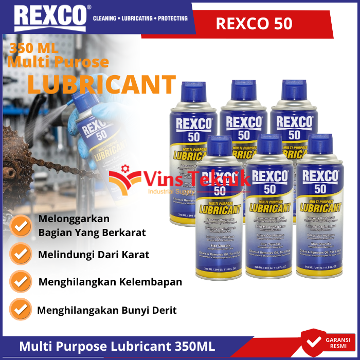 REXCO 50 Multi Purpose Lubricant 350ml adalah cairan multifungsi yang dirancang untuk melumasi, membersihkan, dan melindungi berbagai peralatan logam