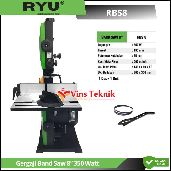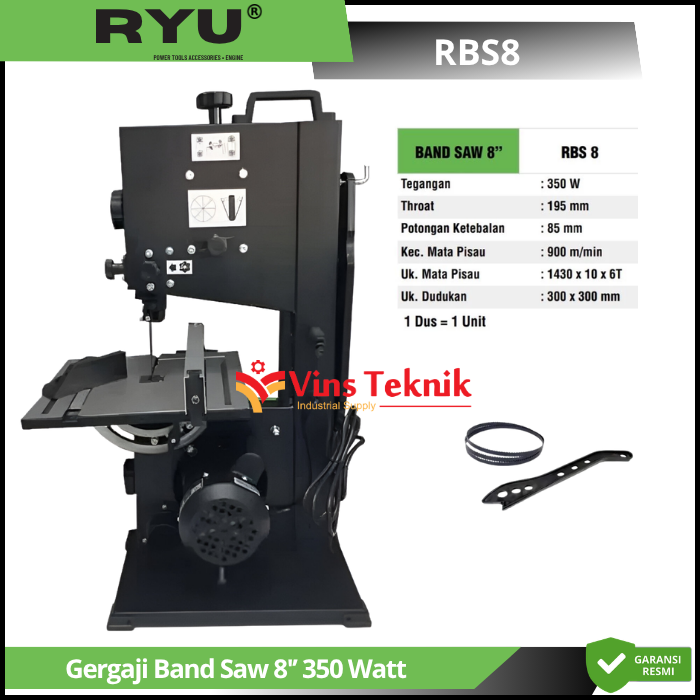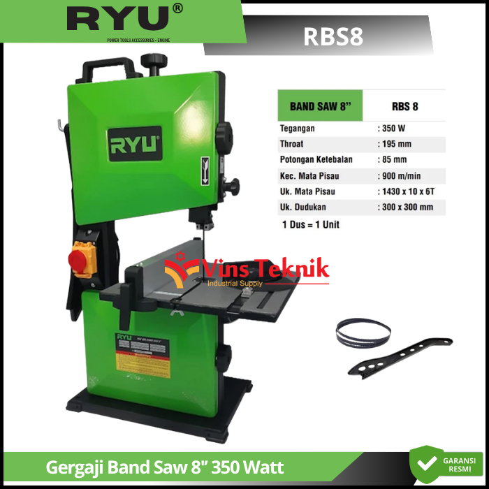 - Rip Fence Aluminium: Dilengkapi dengan pembatas potong (rip fence) berbahan aluminium yang... Read More Fitur utama RYU RBS8 (sering disebut juga RBS 8) adalah kemampuannya sebagai mesin gergaji pita (Band Saw) berukuran 8 inci yang dirancang untuk pemotongan kayu melengkung, detail, atau ukiran dengan presisi tinggi. Mesin ini sangat populer bagi penghobi kayu (woodworking) dan pengrajin karena konsumsi dayanya yang rendah, yakni hanya 350 Watt.