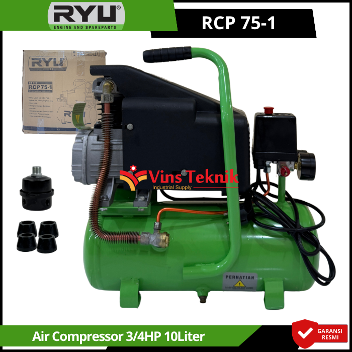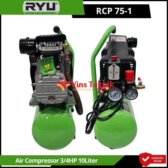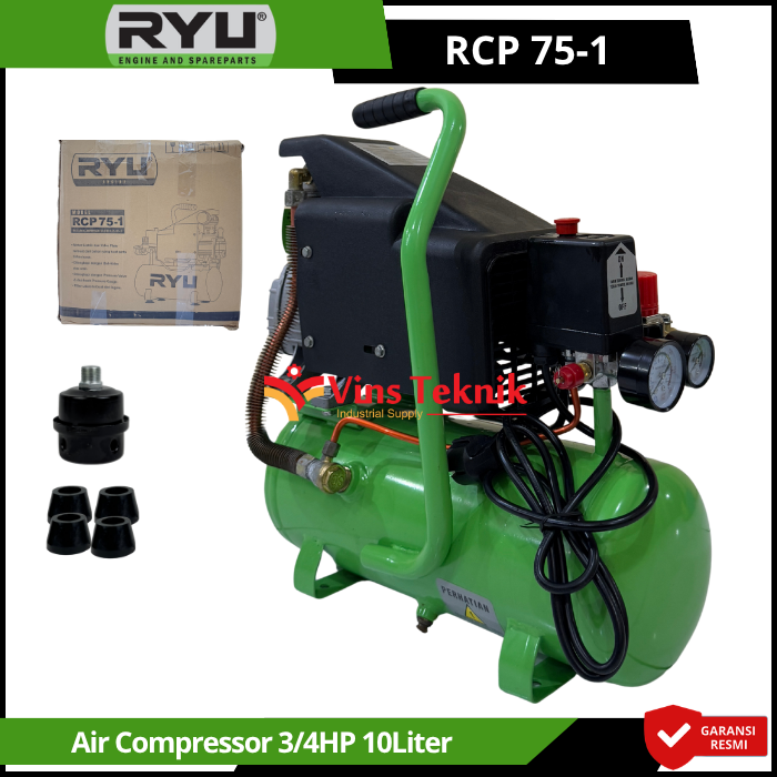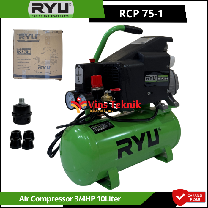 Kompresor RYU RCP 75-1 adalah kompresor angin portable berdaya 0,75 HP yang dirancang untuk penggunaan ringan hingga menengah seperti pengecatan (spray gun), pengisian angin ban, dan pembersihan debu