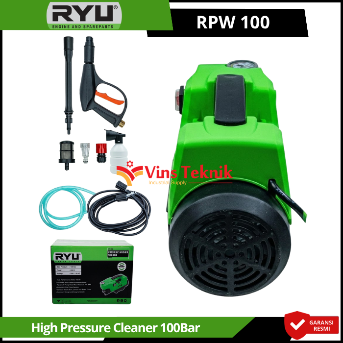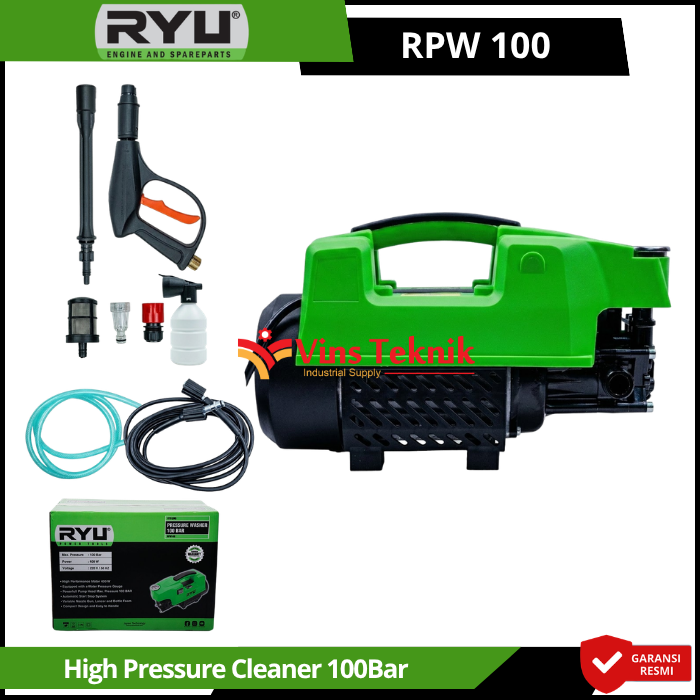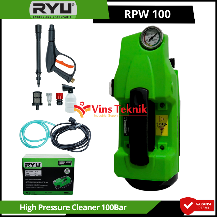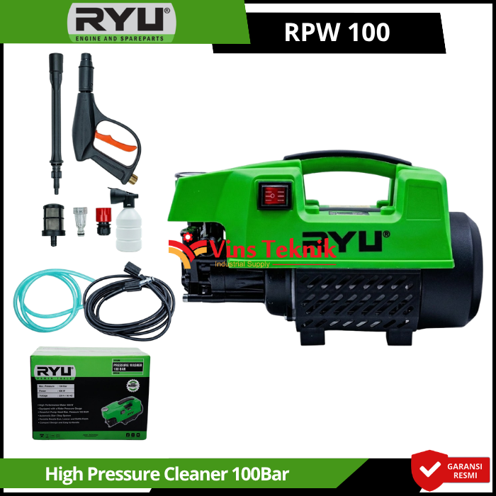 RYU RPW100 adalah mesin pembersih tekanan tinggi (jet cleaner) yang dirancang untuk kebutuhan rumah tangga seperti mencuci kendaraan, AC, hingga membersihkan lumut