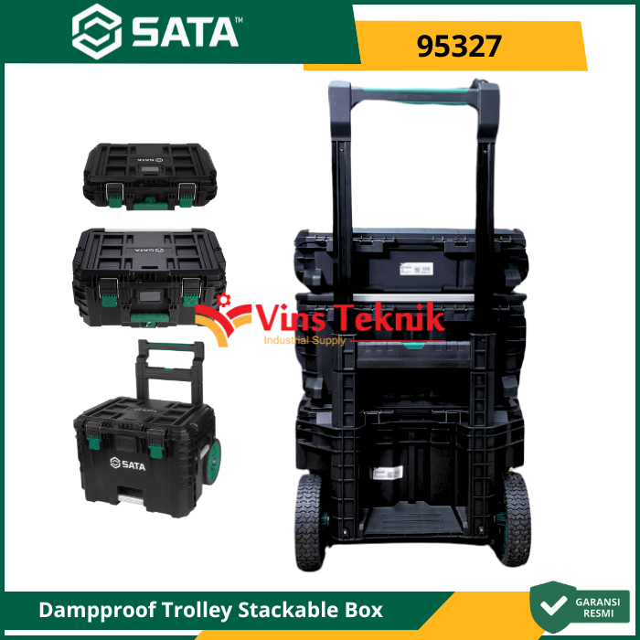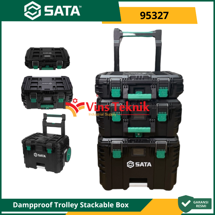 SATA 95327 adalah sistem penyimpanan perkakas bertingkat (stackable tool storage) yang terdiri dari tiga unit box penyimpanan tahan lembap (dampproof)