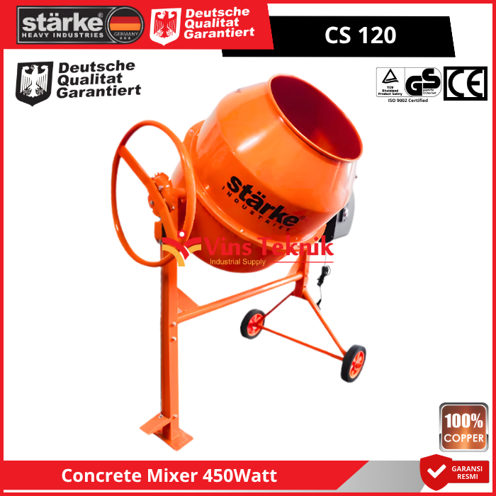 STARKE CS120 adalah mesin pengaduk beton (molen) listrik berkapasitas 120 liter yang dirancang untuk penggunaan skala kecil hingga menengah