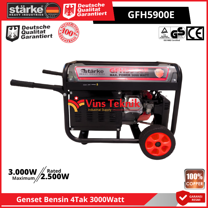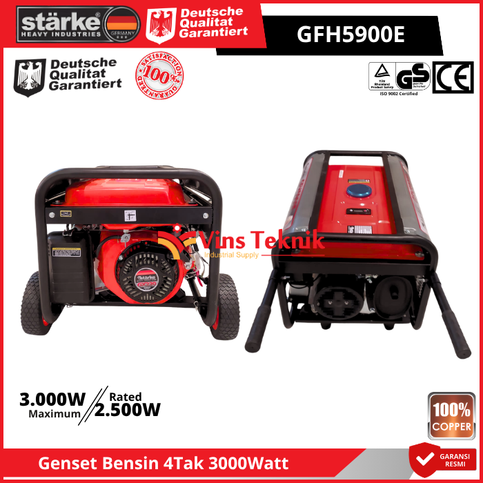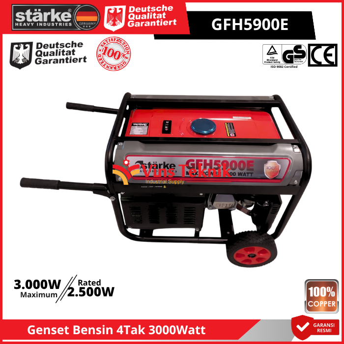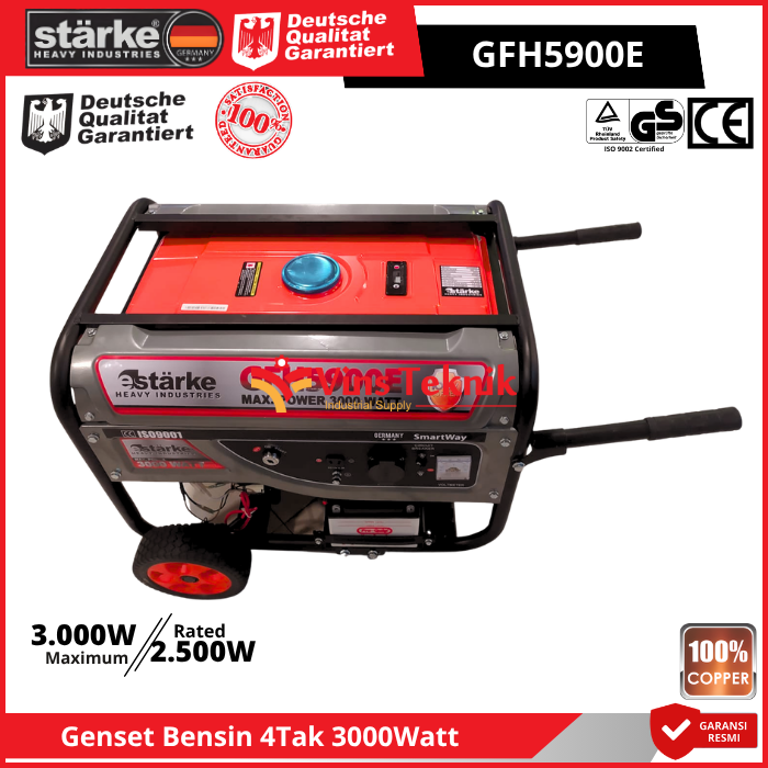 Genset Starke GFH5900E adalah generator listrik bensin yang dirancang untuk kebutuhan rumah tangga atau aktivitas luar ruangan seperti berkemah dengan output maksimal 3000 Watt