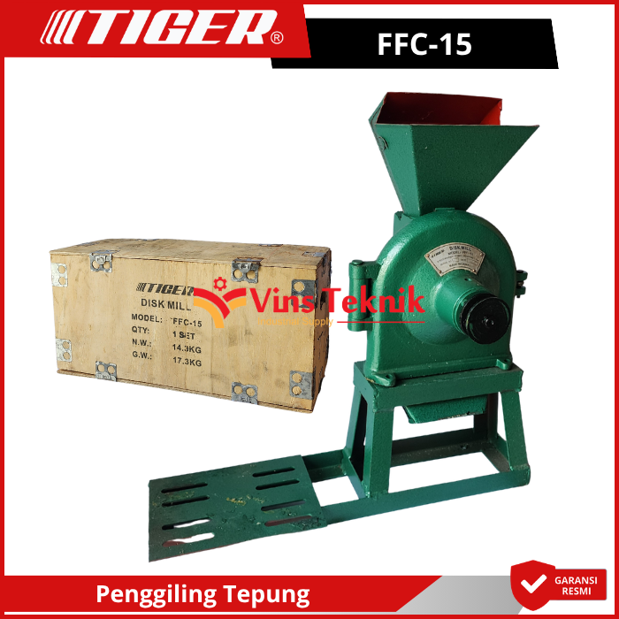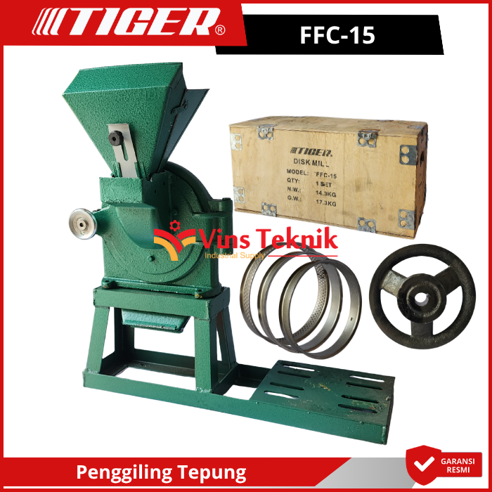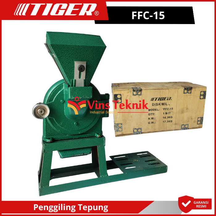 Tiger FFC-15 adalah mesin penepung tipe disk mill yang digunakan untuk menggiling berbagai bahan kering menjadi tepung halus. Mesin ini sangat populer di kalangan UMKM karena ukurannya yang kompak namun memiliki daya tahan yang tinggi