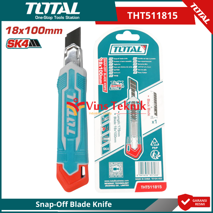 Pisau Total Snap Off Blade dapat digunakan untuk memotong kertas, karton, wallpaper, karpet tipis, dan bahan lainnya. Gagang yang berkontur memberikan kenyamanan dan pegangan yang
