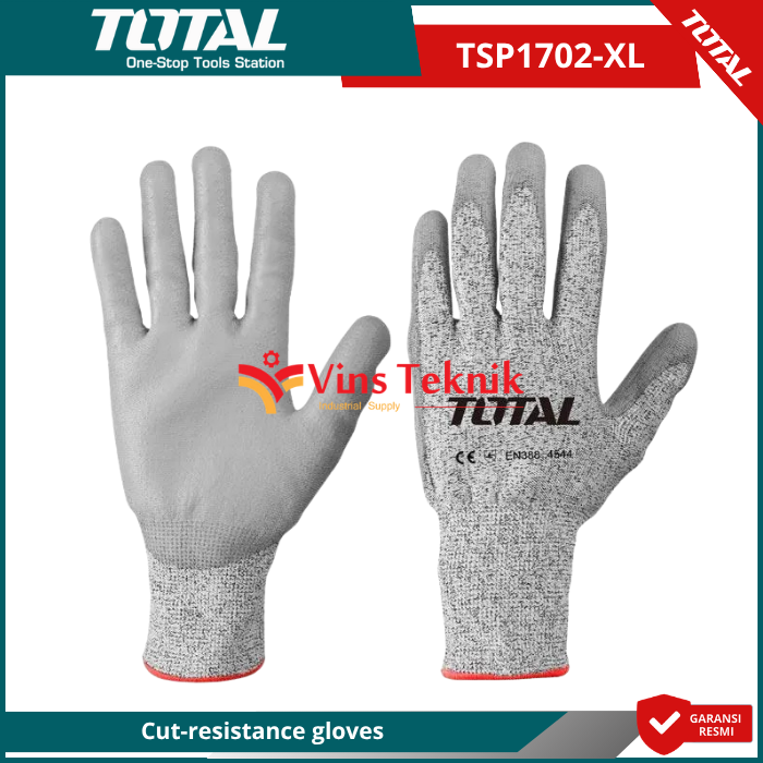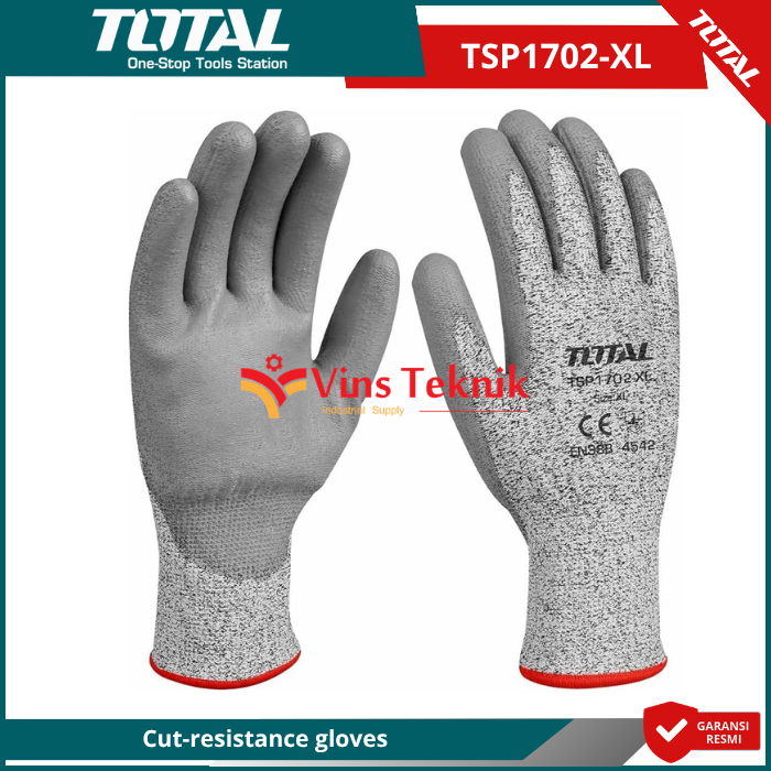 TOTAL TSP1702-XL adalah sarung tangan pelindung anti-sayat (cut-resistance gloves) yang dirancang untuk pekerjaan industri berat. Produk ini menggunakan material serat polietilen berkinerja tinggi (HPPE) yang dipadukan dengan lapisan poliuretana (PU) untuk memberikan perlindungan sekaligus fleksibilitas